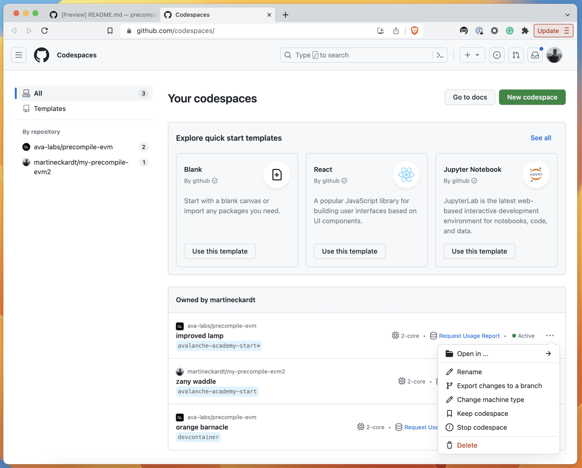 Open a Codespace on the Precompile-EVM Repository on the avalanche-academy-start branch by clicking the button below: