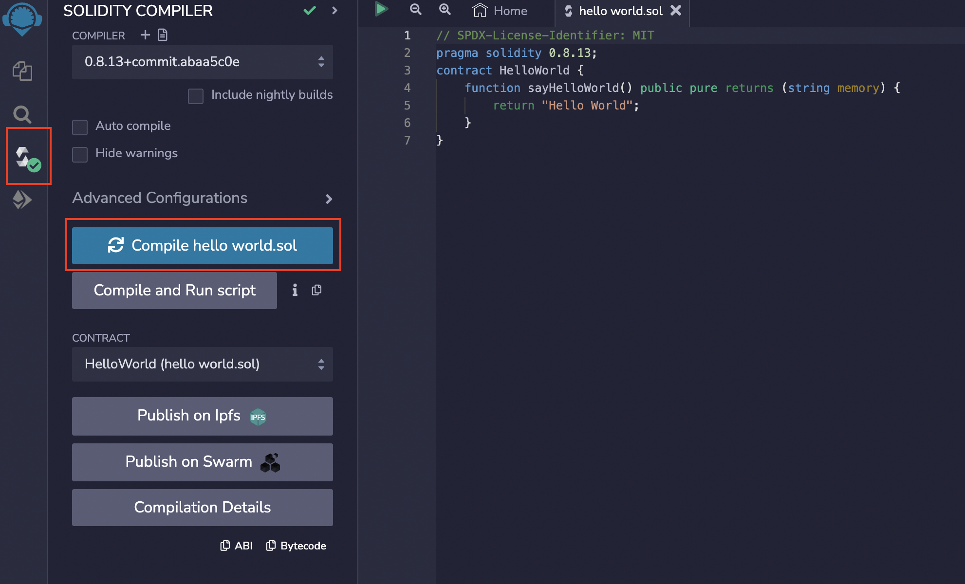 Select the Solidity compiler tab and compile the contract.