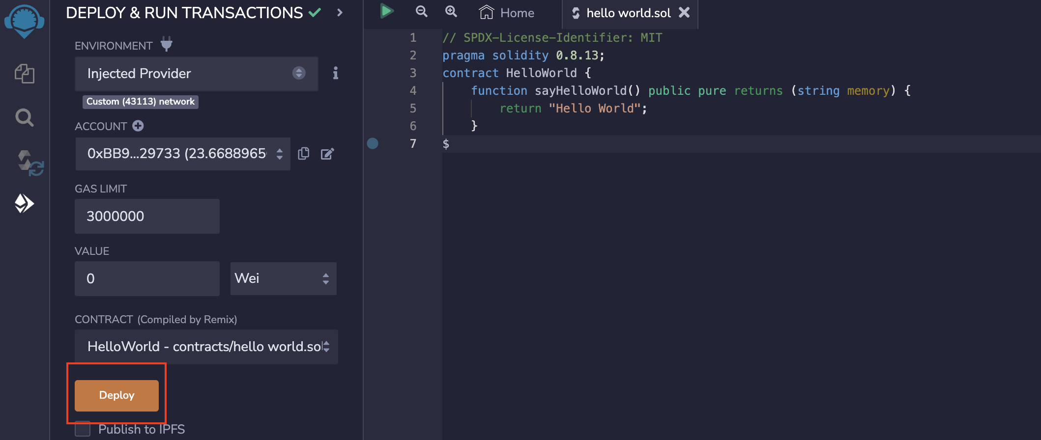Now, the smart contract is compiled, Core is injected, and we are ready to deploy our Hello world contract. Click "Deploy."